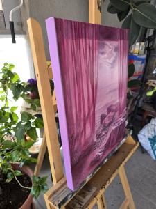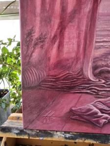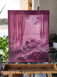 הקומפוזיציה החלומית הזו הופכת חלל מוכר לנוף ים אינסופי. חדר השינה מתמוסס בעדינות אל קו החוף, שם החול והגלים מתמזגים עם הקירות והאור. הקנבס (40×50 ס"מ, שמן על קנבס) צויר בשכבות לכה שקופות ובמעברים עדינים בגווני ורוד ואלמוג, המעוררים את אווירת שחר מוקדם. הטכניקה של המאסטרים הישנים מעניקה עומק וזוהר, בעוד החיבור הסוריאליסטי בין המרחב האישי לאופק הפתוח רומז על הסף שבין העולם הפנימי והחלום. היצירה מזמינה להתבוננות, ומעניקה תחושת רוגע, התרחבות ותימהון שקט.
